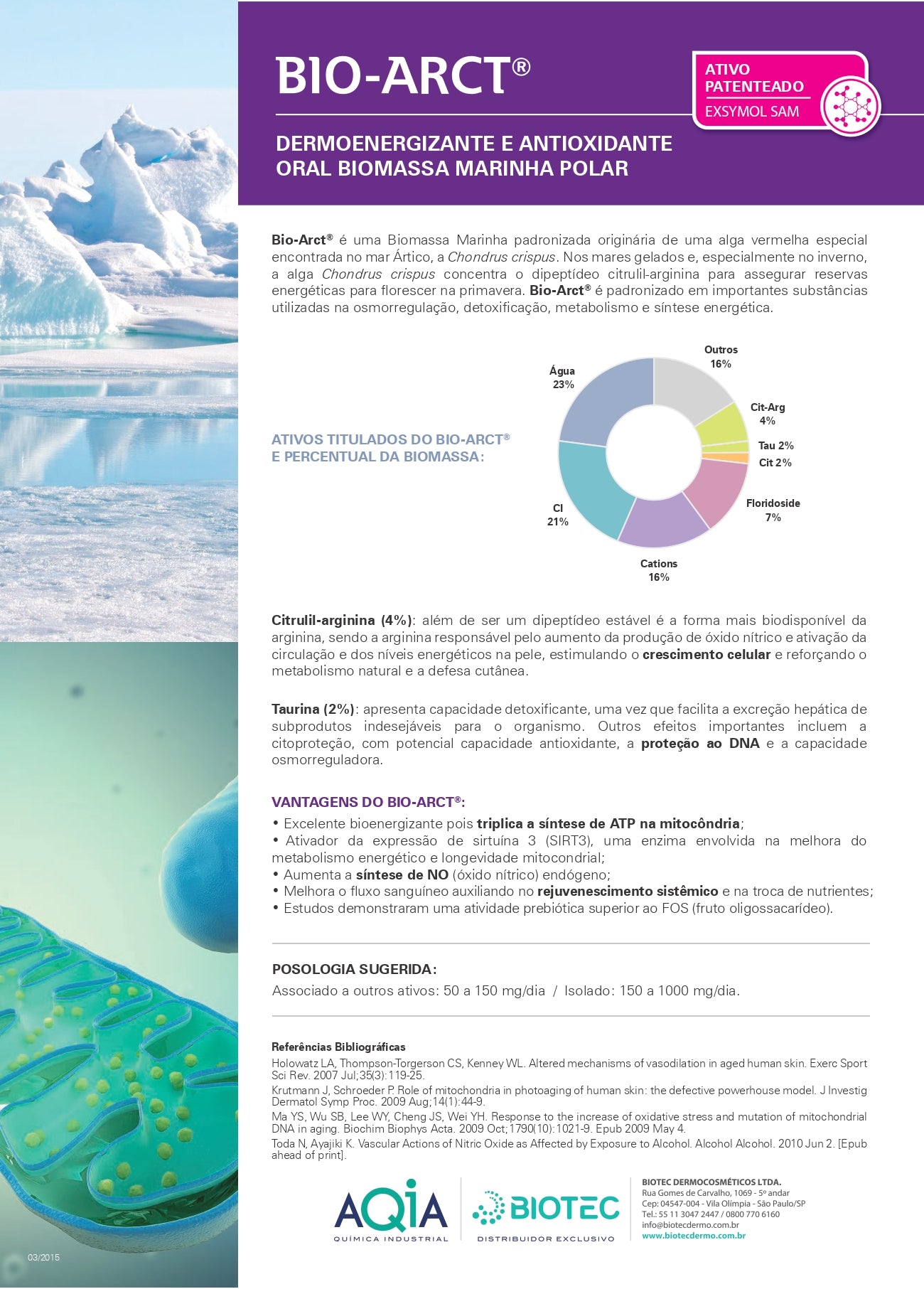 Bio Arct® é uma biomassa marinha proveniente de algas vermelhas que age favorecendo os cuidados com a pele e protegendo-a contra agressores externos. Age em diferentes pontos, desde a hidratação até a melhora cutânea.