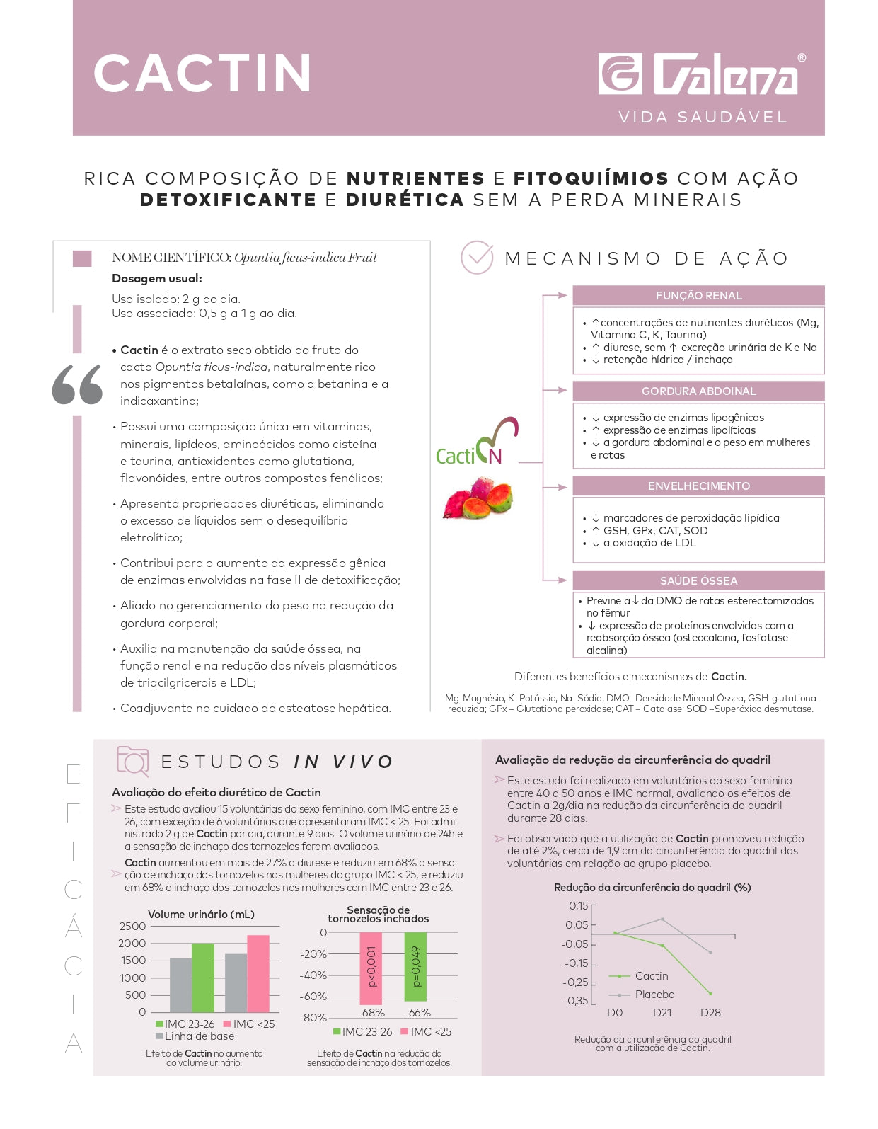 Cactin® é o extrato seco obtido do fruto do cacto Opuntia-ficus. Possui uma composição única em vitaminas, minerais, lipídeos, aminoácidos, como cisteína e taurina, antioxidantes como glutationa, flavonoides, entre outros compostos fenólicos. Apresenta propriedades diuréticas, eliminando o excesso de líquidos sem o desequilíbro eletrolítico, aliado no gerenciamento do peso na redução da gordura corporal.
